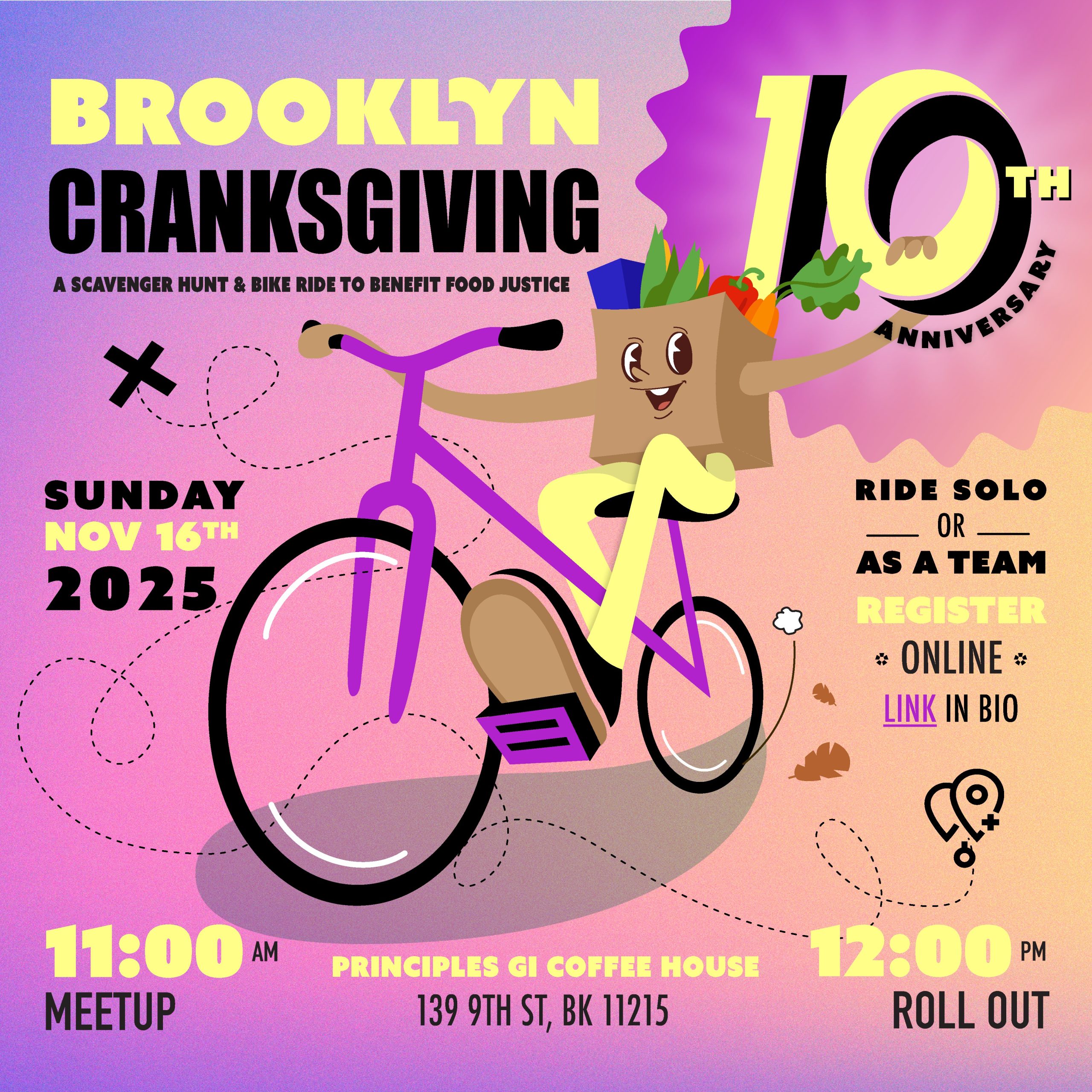 Join us for the 10th anniversary of Brooklyn Cranksgiving — the annual bike-powered food drive and scavenger hunt that’s part race, part adventure, and 100% fun! Ride solo or with friends as you explore Brooklyn, complete quirky challenges, and support local food justice organizations. Start: Principles GI Coffee House (139 9th Street in Gowanus/Red Hook) Check-in: 11am Ride Begins: 12noon End: We will end at Transmitter Brewing (Bldg 77 at 141 Flushing Avenue in Brooklyn Navy Yard) with a special after-party to celebrate 10 years of Brooklyn Cranksgiving! Our ride format is self-led with a "make your own route" style so you can choose how far and where you ride. This is not an organized ride with a pre-planned route. Riders receive a "checkpoint" manifest that gives different options at which to stop. The goal is to visit as many checkpoints as possible within the allotted timeframe, then all riders meet at the finish point to submit their completed manifest, where we'll distribute prizes. You can go in any order and follow whichever route you choose, and volunteers will be on hand to help you build your route if you need help. Check out this video from News 12 to see what this event is like. The ride is free but we strongly encourage riders to donate as much as possible (at least $25) to support this year's food equity partner, One Community NYC, who are doing great work in our community with their Fresh Pantries program. This ride was inspired by the desire to provide meals to people in need around Thanksgiving, and because we recognize that supporting broader food access and justice initiatives are a more lasting solution than simply donating cans of food, we have chosen to have riders donate money directly to various food-focused initiatives. All ages and skill levels welcome. Come solo, bring friends, or we’ll help match you with a group. Costumes are optional — but highly encouraged (Thanksgiving or leftover Halloween vibes always win big).Brooklyn, NY