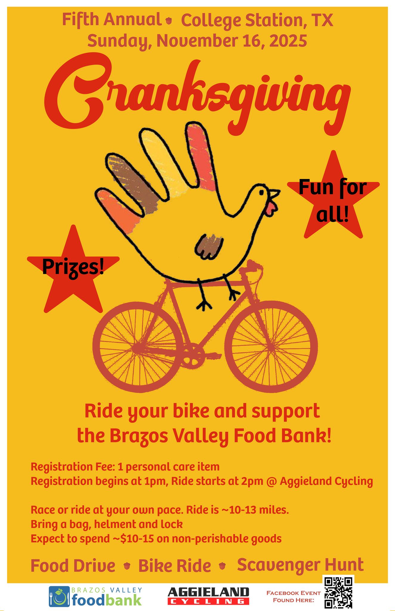 Cranksgiving is a food drive on two wheels that is part bike ride, part food drive, part scavenger hunt. All riders will be given a manifest with grocery store checkpoints and a list of non-perishable goods to be purchased for donation to Brazos Valley Food Bank.