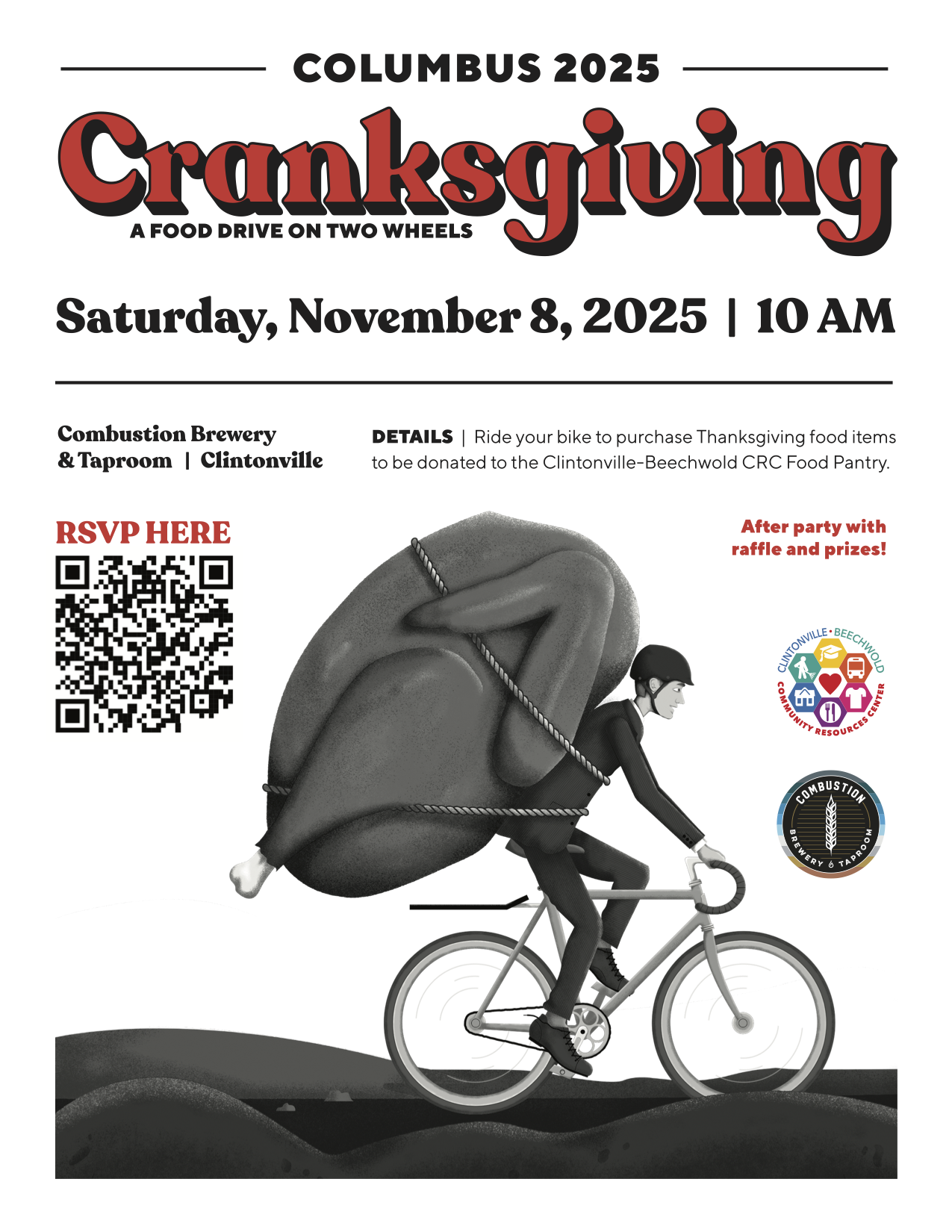 Please join us for the Columbus edition of Cranksgiving, a food drive on two wheels! This is a free event for anyone with a bike and a desire to do good. Show up on two wheels, and we’ll hand you a list of Thanksgiving food items to purchase for the Clintonville-Beechwold Community Resource Center Food Pantry. You'll then ride to local grocery stores, buy whatever you'd like to donate, and carry it by bike back to the food pantry. You can then return to our ride start/finish, Combustion Brewing, for some post-ride socializing and fun! We'll have a prize for the person who hauls the most donations by weight and a raffle for all participants!Columbus, OH