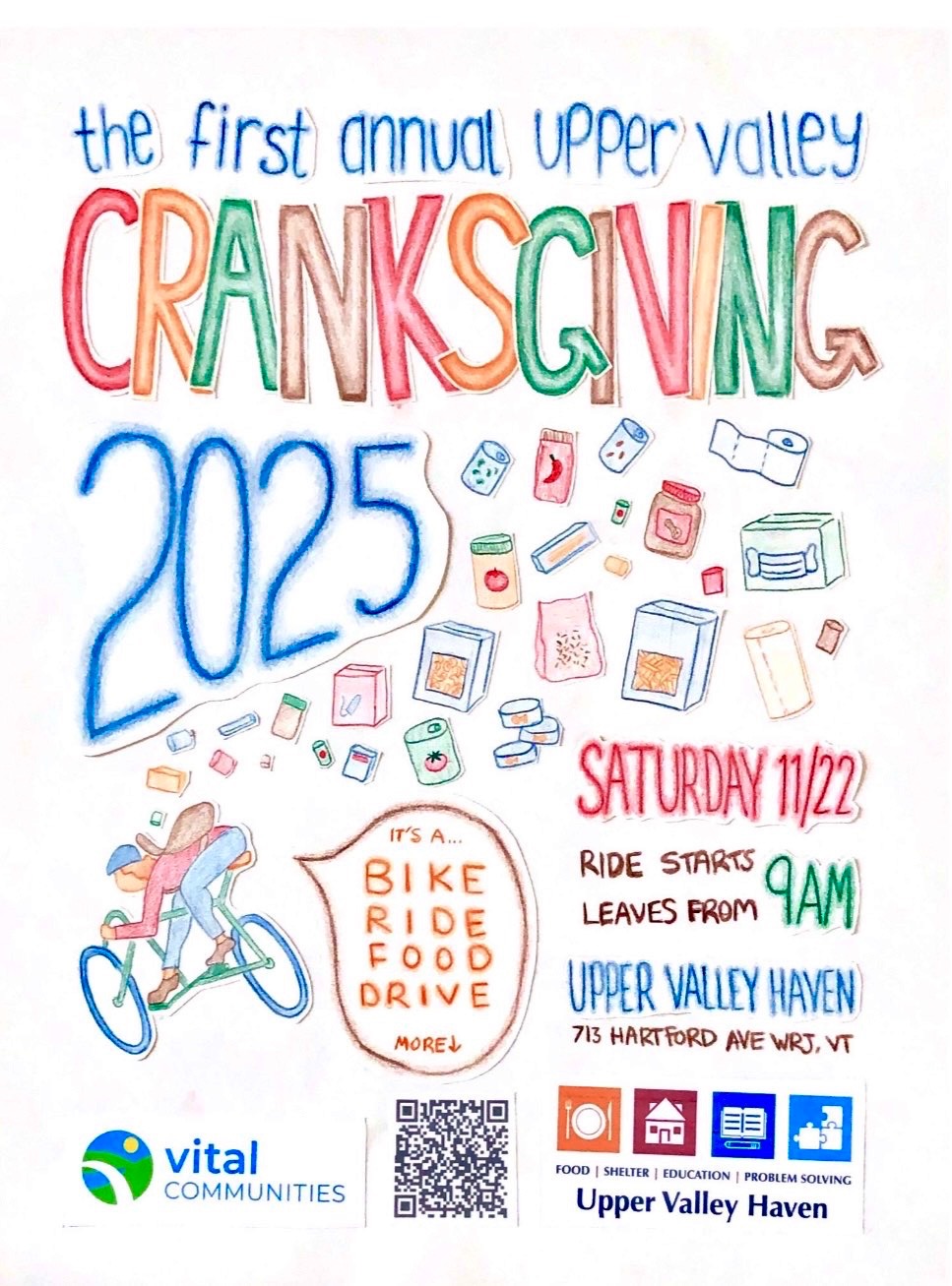 Cranksgiving is a food drive with a twist! Hop on a bike to collect needed items at nearby stores, either racing your friends or taking your time to gather a huge donation! The event is free! What you need to bring: What we have for you: Donations will go to our host, the Upper Valley Haven. Once you've collected all your items and arrived at the finish, prizes will go to the speediest ride, the heaviest load, and the best outfit/costume! Note: Bathrooms will be a short bike ride away from the start, but right there for the finish. Plan accordingly. The ride starts at 9am, but get there earlier for time to enjoy a warm beverage and chat with your community! We hope to see you there! Check us out on instagram @ uvcranksgiving !Hartford, VT