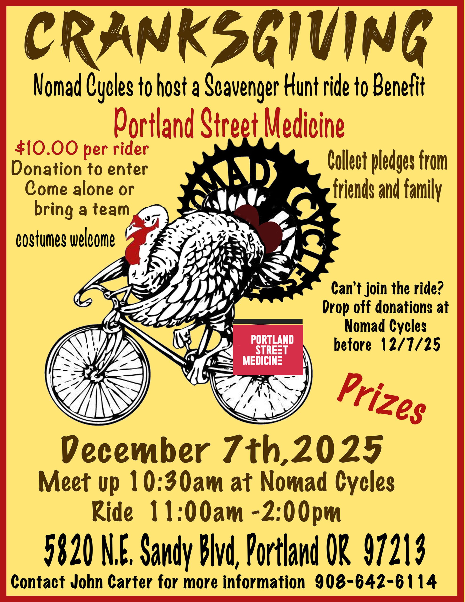 Cranksgiving "Portland Style" Wet and Wild Tis the season for riding in the rain and playing in the puddles to support Portland Street Medicine with a fun ally cat ride. The ride cost $10.00 to enter. Collect donations from family and friend before the ride and continue to collect during the ride. All proceeds will be donated to support the amazing work done by the teams at Portland Street Medicine. All bikes are welcome from street to electric we encourage all to join in. All you need is your generous heart, a willingness to ride rain or shine, a bike with wheels 2,3... we don't judge, a bag and a lock. We have planned two scavenger rides up and down and all around Portland for you to find either a QR code or photo proof of discovery. One ride will be designed for non electric riders and one for electric riders Choose your course and have fun. After you've collected all the needed codes or photo before the time runs out dash back to Nomad Cycles where we will be awarding prizes. Cranksgiving is a national event that occurs in over 100 cities across the United States and Canada. Visit www.cranksgiving.org for more locations. Meet Up begins at 10:30 behind Nomad Cycles on NE Alameda Ride begins at 11:00AM and ends 2:00PM Ride 1 Non Electric Bikes Ride 2 Electric Bikes Coffee and treats will be provided Prizes will be awarded when the ride is over Costumes are welcome All are welcome teams are welcome Bike Clubs are welcome A family of bike riders Portland, OR