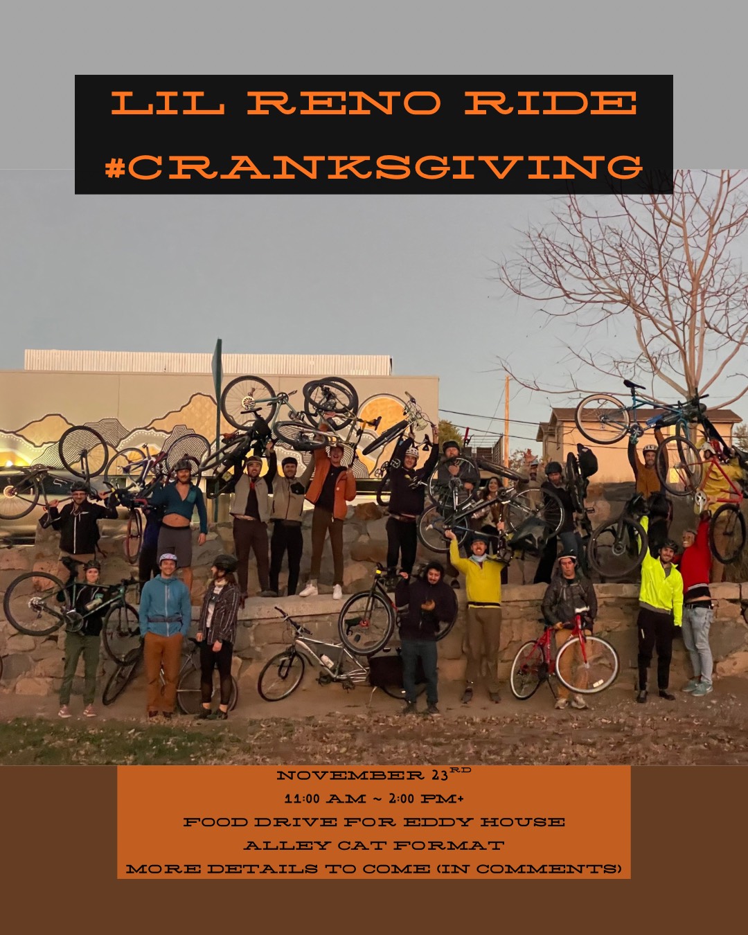 Biggest Lil Cranksgiving: November 23rd 11:00 AM ~ 2:00 PM+ Food Drive for Eddy House Alley cat format means you will be given a list of stores and supplies to collect from those stores this is the “manifest”. Manifest will be (digitally) distributed at the start of the ride. Be prepared for a ~12 mile ride around downtown/midtown. Recommended to team up in groups of 3 to 4 for bike watch etc. Food/Supplies anticipated to cost each rider ~$20. Be prepared with bike racks and or bags to carry the supplies you are collecting.Reno, NV