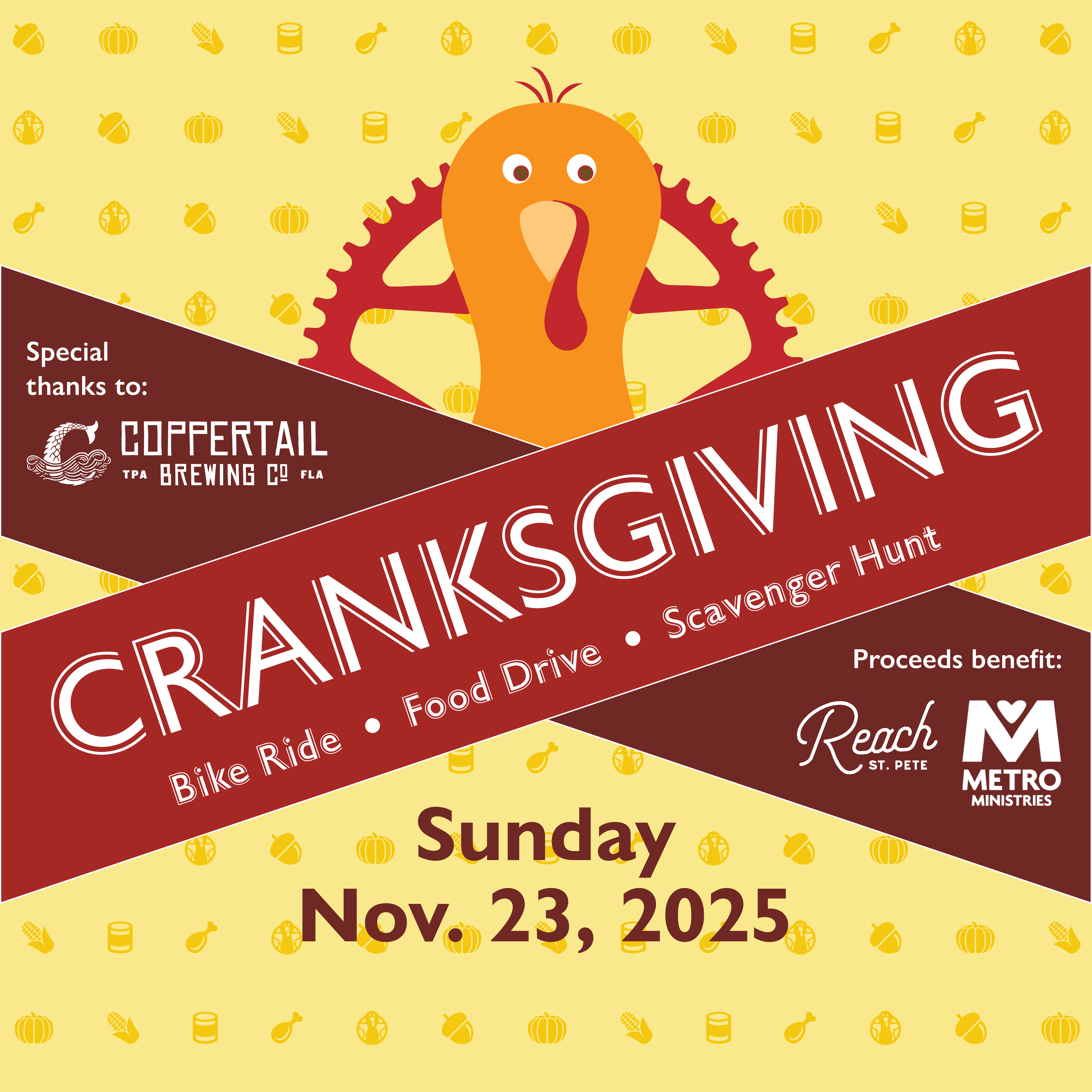 Cranksgiving is a bicycle scavenger hunt and food drive, and these events take place across the nation during the month of November to benefit local charities as they prepare for Thanksgiving. The 14th edition of Cranksgiving Tampa will continue to benefit Metropolitan Ministries.