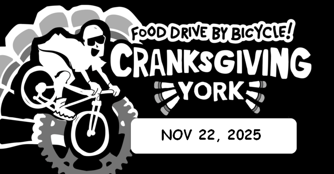 Cranksgiving York is a fun food drive by bicycle to benefit The York County Food Bank! Register at bikereg.com/cranksgiving-york More Details Coming soon! Registration opens Nov. 1! The Princess Street Food Bank is undergoing renovations so we will be meeting across the street at Logos Academy. All you need is a bike and a bag to carry the food! At registration, you will receive an itinerary that includes a map of the area, a list of grocery stores, and shopping list of food to purchase. This is not a race. You may leave after registration, as there is no mass start. You will plot your own route to as many of the stores as you'd like using the map provided, while buying the item/s on the list to bring back to the Logos Academy by 11:30am. Riders typically travel 10-15 miles and spend $30-35, however you may ride to as many stores as you'd like and purchase what you can afford, there is no minimum to participate. Participating riders should be comfortable riding on open city streets and in potentially heavy traffic and be prepared to carry the items purchased back to the Food Bank. Turkey Bonus! For every turkey purchased you will get a raffle ticket for a special prize! The winner will be picked at the after party. No need to be present to win, just be sure to include your name and number on the ticket. Raffle: All riders will receive 1 raffle ticket for the prize table with registration. You will chose the raffle item you wish to be entered in before leaving on your ride and winners will be chosen before your return. Kind of a Race Raffle: Alley Cat vibes are back! Visit at least 8 stores and buy at least 2 items at each to be entered to win a to be announce prize that's a little more valuable than the general raffle prizes. You must be preregistered (no day of) and save your receipts to hand in when returning to the food bank.York, PA
